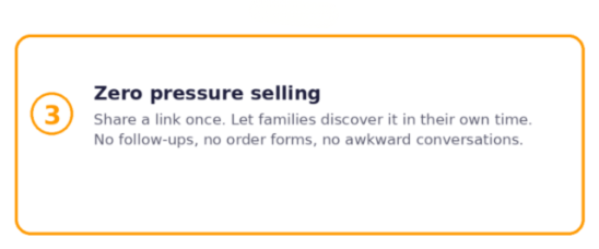 No product inventory. No awkward selling. No events to organize. Just a link that works for you around the clock.